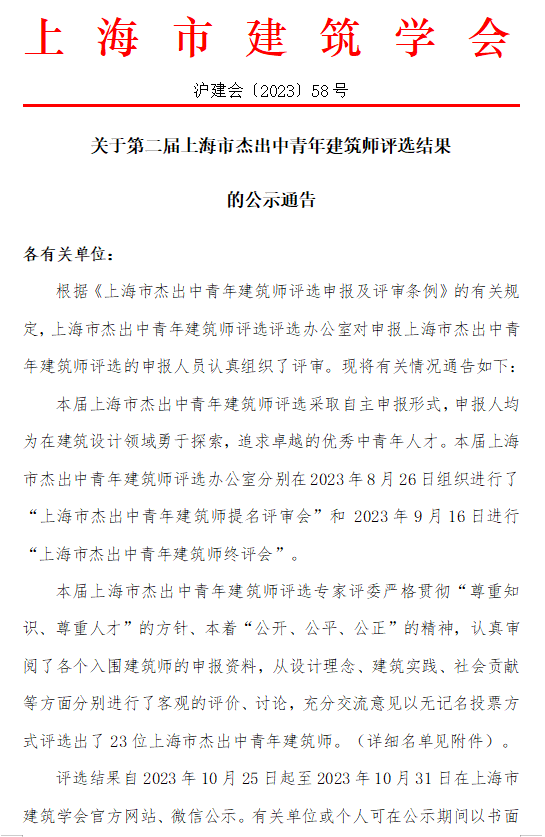 关于第二届上海市杰出中青年建筑师评选结果的公示通告