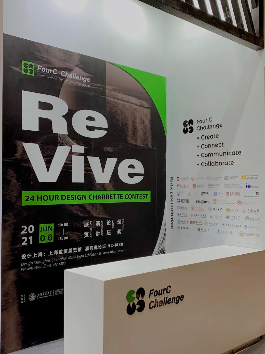 2021年6月6日,FourC Challenge 24小时设计挑战赛“ReVive 康复·再生”院长高峰论坛暨闭幕颁奖典礼于上海世博展览馆顺利举办,标志着2021 FourC Challenge 24小时设计竞赛正式落下帷幕。交大设计首次携手“设计上海”,上海市建筑学会受邀出席,活动还邀请了同济大学、湖南大学、西交利物浦大学、南方科技大学、北京林业大学、英国皇家建筑师学会、以及上海交通大学国际合作与交流处等单位代表出席。全国各地在本次竞赛中获奖的团队成员被邀请前来参观“设计上海”展会,并被授予奖项。活动向公众传达了FourC Challenge的举办理念,以视频投影的形式展示往届和本届的优胜作品,体现当代设计学子的设计力量。